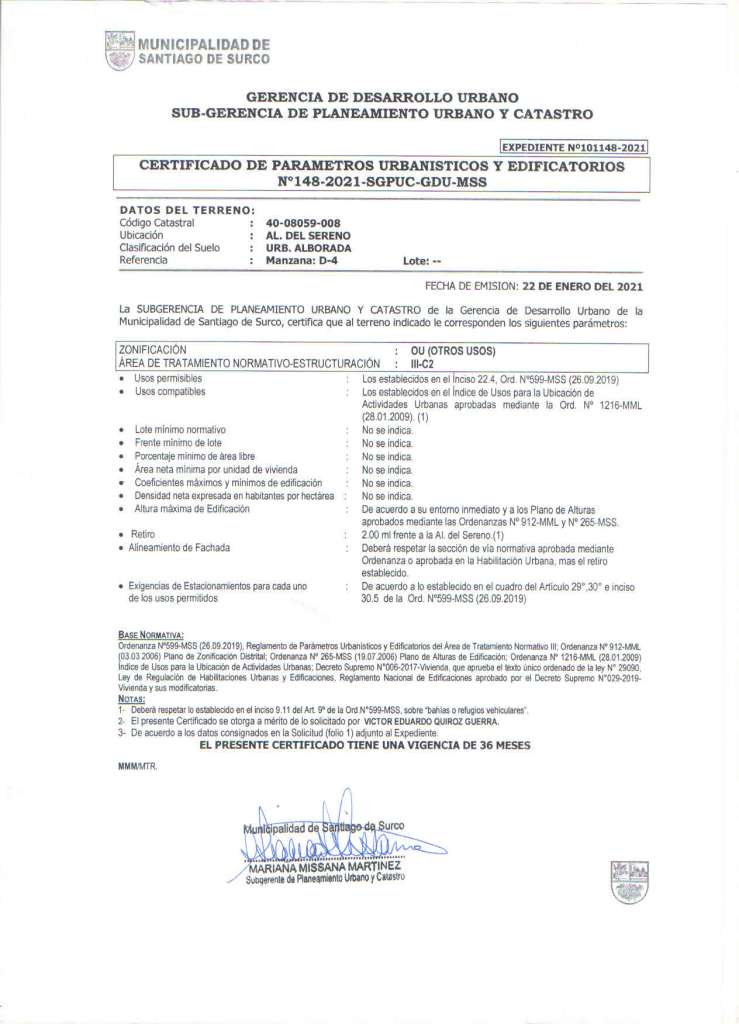 - El certificado de parámetros otorgado por la municipalidad de surco le otorga la zonificación de otros usos (OU), perfectamente compatible con el asignado en el plano de habilitación urbana donde se le califica como manzana para CASA COMUNAL.
