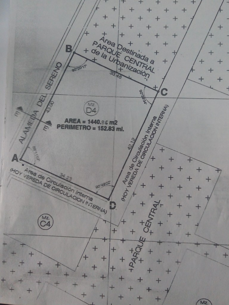 - La manzana D4 tiene un área de 1440 m2; dos de sus frentes salen directamente a paseos peatonales el tercero colinda directamente con el parque. solo el cuarto lado da frente a la ALAMEDA del SERENO, una vía donde el transito de vehículos es restringido, lo que define su accesibilidad para el uso como residencia exclusiva para personas mayores como se puede ver de estas vistas del centro del terreno hacia cada uno de los vértices de sus cuatro lados.