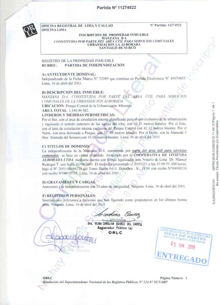 - La manzana esta integrada temporalmente al parque La Alameda, toda el área del terreno esta sembrada, con arboles y su uso publico es como área de parque bajo la administración y el cuidado de la municipalidad de Santiago de SURCO.