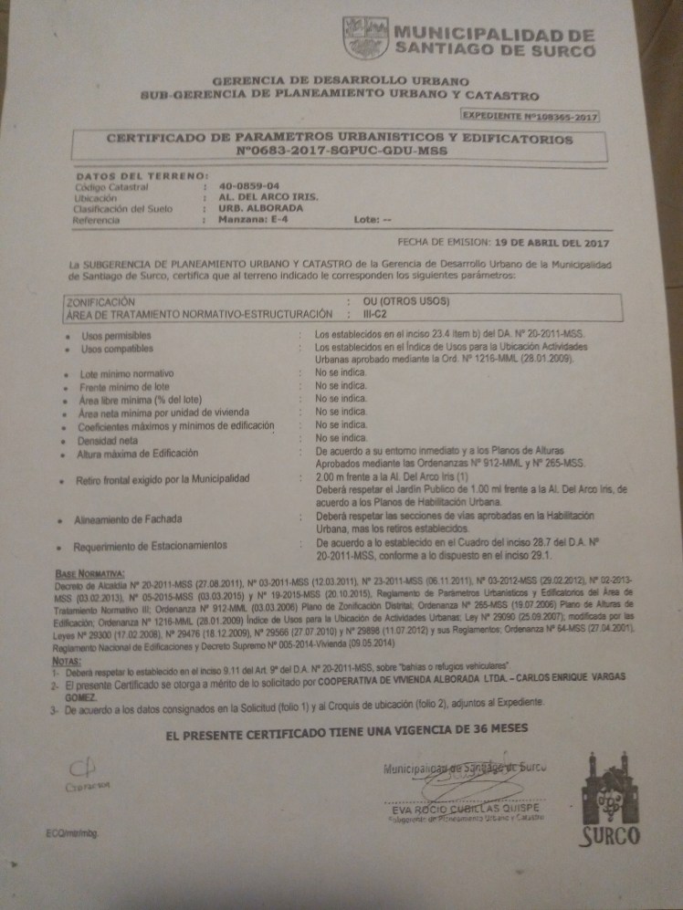 - El certificado de parámetros otorgado por la municipalidad de surco le otorga la zonificación de otros usos (OU), perfectamente compatible con la actividad urbana de EDUCACIÓN PRE ESCOLAR y uso residencia, se resalta el hecho que la habilitación urbana asigna el uso de SALAS de CINE en la inscripción del plano de desarrollo urbano inscrito en los registros públicos de Lima y que diera origen a la urbanización Alborada en el distrito de Santiago de Surco.