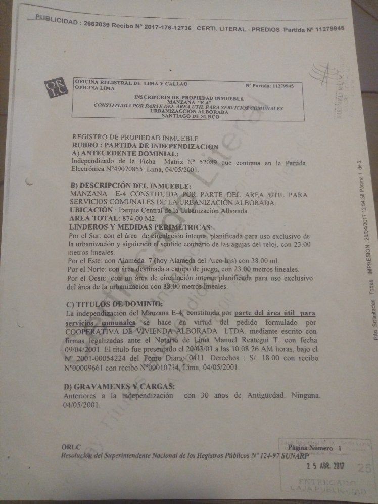 - El uso actual es publico, como área de parque bajo la administración y el cuidado de la municipalidad de Santiago de SURCO.
